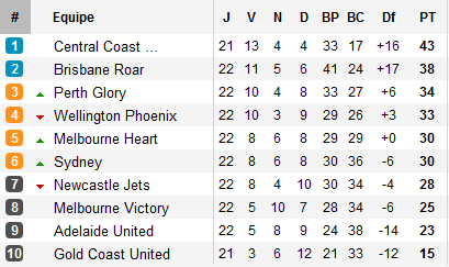 Car Brisbane compte désormais quatre points d’avance sur le nouveau troisième : Perth. Les Glory s’imposent chez eux devant Newcastle et devancent désormais Wellington, à une semaine d’accueillir Brisbane !