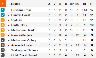 Reste que cette cinquième victoire de la saison permet à Brisbane de prendre le large. Car derrière, Sydney tombe face aux Mariners, nouveau dauphin, et Perth sauve un nul miraculeux à dix contre onze sur le terrain des Melbourne Victory (égalisation de Smeltz à cinq minutes de la fin).