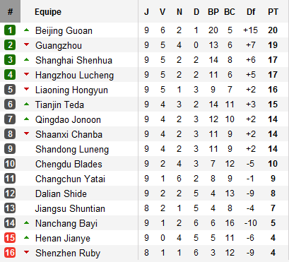 En haut du classement, deux équipes restent bien placées en embuscade derrière les leaders : Shanghai et son buteur argentin Luis Salmerón (7 buts en 9 rencontres) et Hangzhou, seule équipe à avoir fait chuter Beijing, pointent à 3 longueurs de la tête.