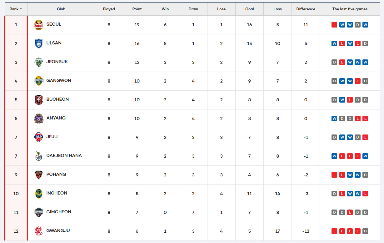 Cette défaite du club de la capitale profite donc à Ulsan qui revient à trois points après avoir écrasé Gwangju (5-1). Les Griffons enchaînent leur quatrième défaite consécutive et reste bon dernier. Du côté de Jeonbuk, cette porte ouverte du FC Seoul s’est refermée assez vite puisque les Green Warriors ont été tenus en échec par Gangwon (1-1).