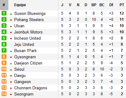 Car en tête du classement, les quatre premiers se tiennent désormais en deux points. Suwon s’impose chez lui devant Daegu (avec au passage le premier but en K-league du nord-coréen Jong Tae-Se) et prend la tête, profitant ainsi du nul concédé par Pohang chez lui face à Incheon.