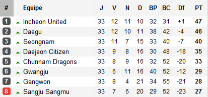 La lutte pour la relégation devrait donc concerner essentiellement Gwangju et Gangwon. Opposés ce week-end, les deux derniers du classement se rapprochent l’un de l’autre suite à la victoire de Gangwon. Un point sépare les deux équipes, une seule sera reléguée.