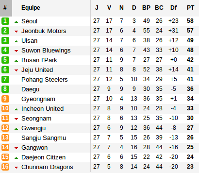 Au sommet du classement, le duo Seoul – Jeonbuk se livre à une lutte sans merci pour terminer en tête. Le FC Seoul profite de la 27e journée pour reprendre les commandes en profitant du nul entre Busan et Jeonbuk mais surtout en arrachant un incroyable succès à Seongnam. Menés au score Seoul égalise à deux minutes de la fin par Mauricio Molina avant de s'imposer au bout des arrêts de jeu grâce à son autre star offensive Dejan Damjanović (qui signe au passage son 19e but de la saison).