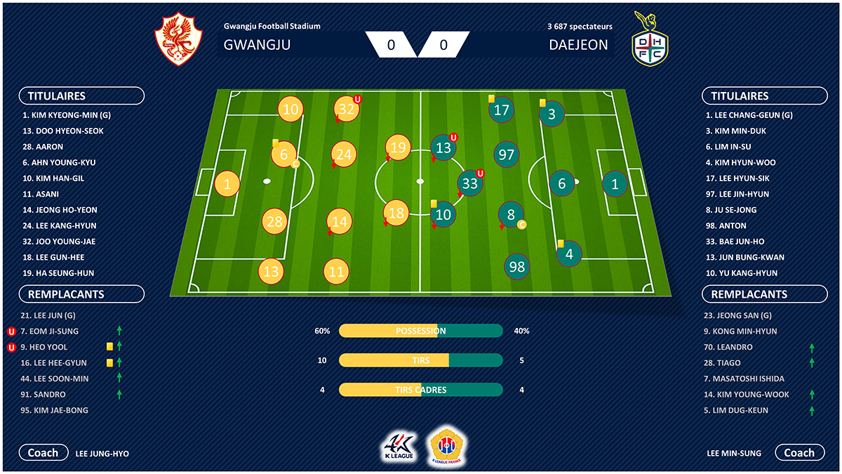 Dans cette confrontation des promus, Gwangju et Daejeon avaient pour ambition de se relancer après avoir chacun connu la défaite au match précédent. Côté Gwangju, plusieurs changements pour essayer de redynamiser l'équipe. Letschert, suspendu, est donc remplacé par Aaron en défense centrale, tandis que Eom Ji-sung, Lee Soon-min et Heo Yool prennent place sur le banc. Shin Chang-moo (blessure) est lui forfait. Asani, Joo Young-jae, Ha Seung-hun et Lee Kang-hyun sont titularisés. Côté Dajeeon, Oh Jae-suk laissait sa place à Kim Hyun-woo en défense tandis que les deux Brésiliens, Tiago et Leandro prenaient place sur le banc remplacés par Jun Bung-kwan et Yu Kang-hyun.
