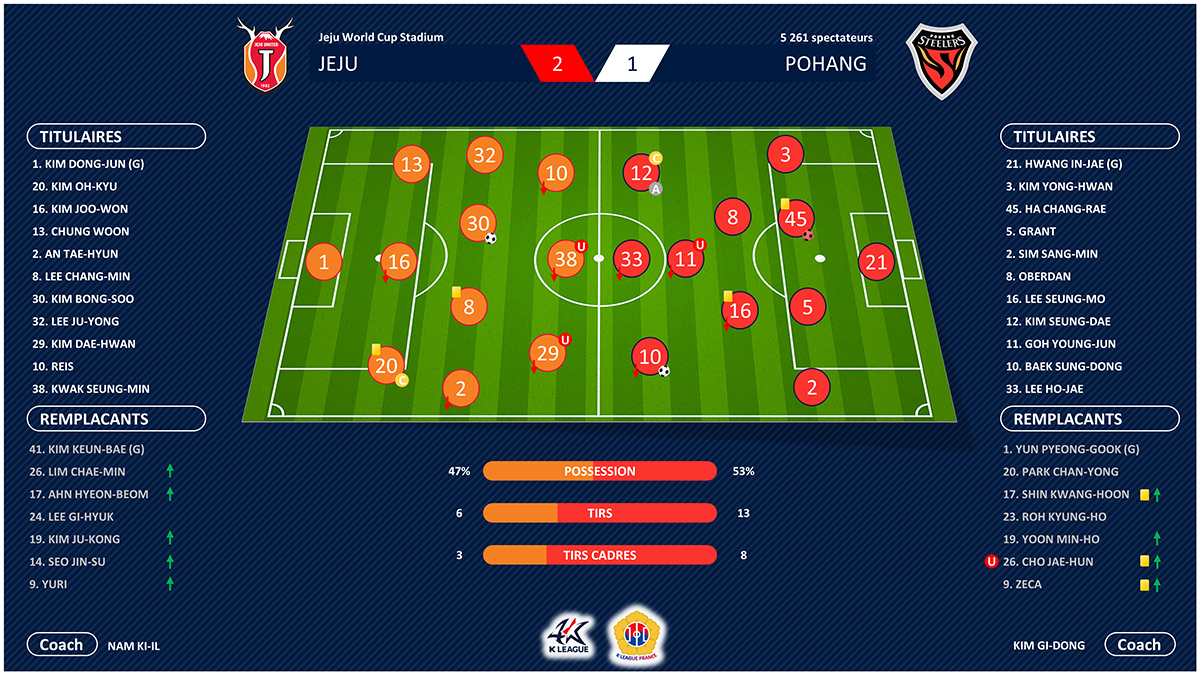 Sur le terrain, pas grand-chose à se mettre sous la dent pendant les vingt premières minutes avant que Kim Dong-jun ne manque son dégagement, ce qui profite à Baek Sung-dong qui ajuste de loin pour l'ouverture du score (24e, 0-1). Jeju tente de réagir en continuant de mettre le pied sur le ballon mais sans se montrer dangereux. C'est même Pohang qui se procure la seconde plus grosse occasion du match juste avant la pause mais la reprise acrobatique de Go Young-jun fuit le cadre. En seconde période, il ne fait que dix minutes à Jeju pour renverser la situation. D'abord sur un coup du sort puisqu'Alex Grant, souhaitant dégager le ballon, tire directement dans Ha Chang-rae qui dévie le cuir au fond des filets. Un but gag qui relance le match (48e, 1-1)). Quelques instants plus tard, alors que l'Australien manquait de se racheter en butant sur Kim Dong-jun, c'est Kim Bong-soo qui donnait l'avantage aux Insulaires en deux temps sur corner (55e, 2-1). Puis vient le Kim Dong-jun show. Le portier de Jeju va écœurer les attaquants de Pohang puisqu'il s'impose devant Sim Sang-min, Go Young-jun et Oberdan alors que Zeca trouve la transversale. De quoi se racheter de son erreur sur le premier but puisque Jeju empoche sa troisième victoire consécutive, la première à domicile cette année, tandis que Pohang enchaîne une deuxième défaite d'affilé mais reste néanmoins sur le podium. À noter que Lim Chae-min s'est blessé en fin de match alors qu'il revenait tout juste de blessure.