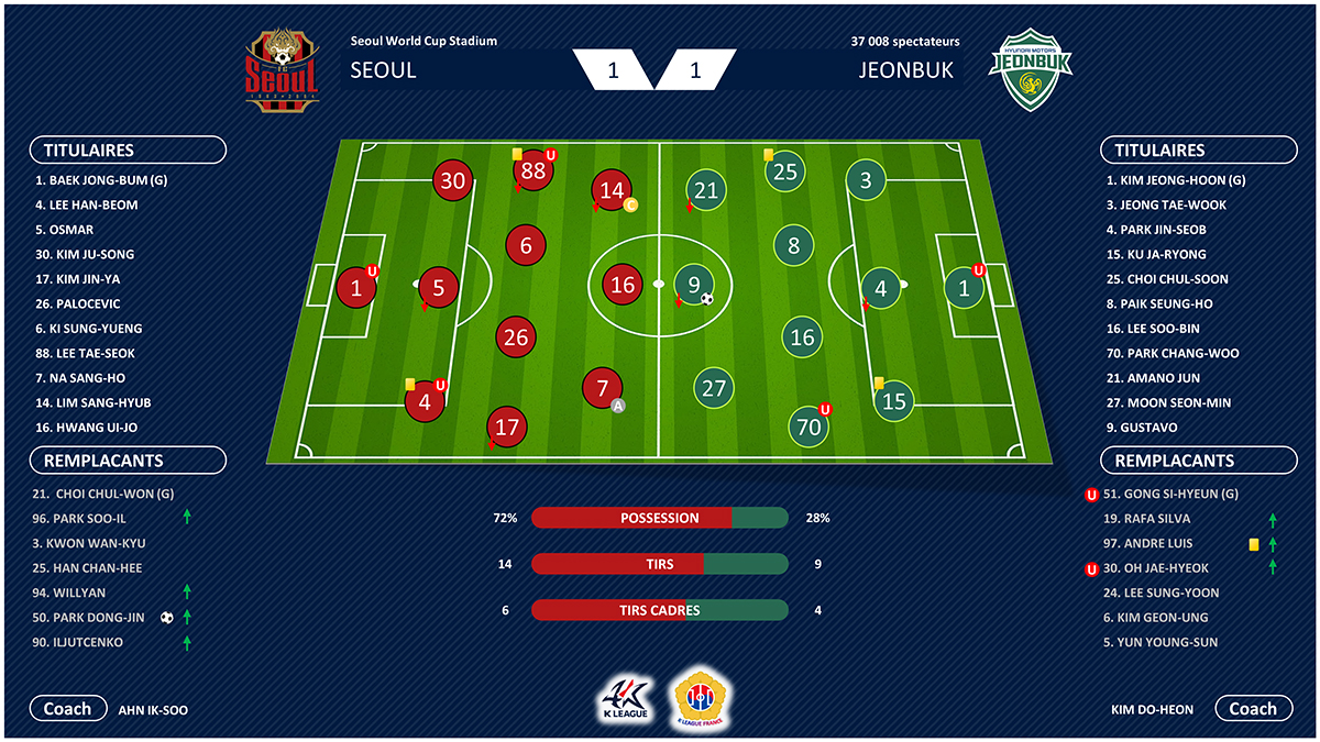 En position de force, le FC Seoul a néanmoins fait du FC Seoul. Dès le coup d'envoi, Lee Tae-sok adresse une passe molle à Kim Ju-song qui se fait devancer par Gustavo. Le Brésilien ne se prive pas d'aller tromper le portier des Rouge et Noir pour ouvrir le score (1e, 0-1). Une douche froide, et pas à cause de la pluie qui s'abat sur le stade. Sonné le FC Seoul a bien failli l'être une seconde fois quelques minutes plus tard lorsque Amano Jun alertait Baek Jong-bum sur coup franc. Mais le club de la capitale se reprend et met le pied sur le ballon, cherchant la faille dans le bloc défensif de Joenbuk. Les situations s'enchainent mais Lim Sang-hyeob se voit refuser un but et Hwang Ui-jo est trop court. La seconde période est de même facture avec un contrôle du ballon de Seoul. Mais Jeonbuk est tout proche de tuer le match lorsque Rafa Silva se présente face à Baek Jong-bum, mais le jeune portier s'impose dans le duel entre les deux hommes. Dans la foulée, Park Dong-jin égalise de la tête faisant parler sa puissance entre les défenseurs de Jeonbuk. Le score ne bouge plus. Un mauvais résultat pour Seoul qui affrontait un Jeonbuk mal en point. Les Rouge et Noir affichent toujours des difficultés face aux grosses écuries du pays. Toujours second, le FC Seoul laisse néanmoins s'envoler Ulsan. Pour les Green Warriors, ce nul arrêt l'hémorragie mais ne rassure pas par le style. D'autant plus que Amano Jun est sorti sur blessure.