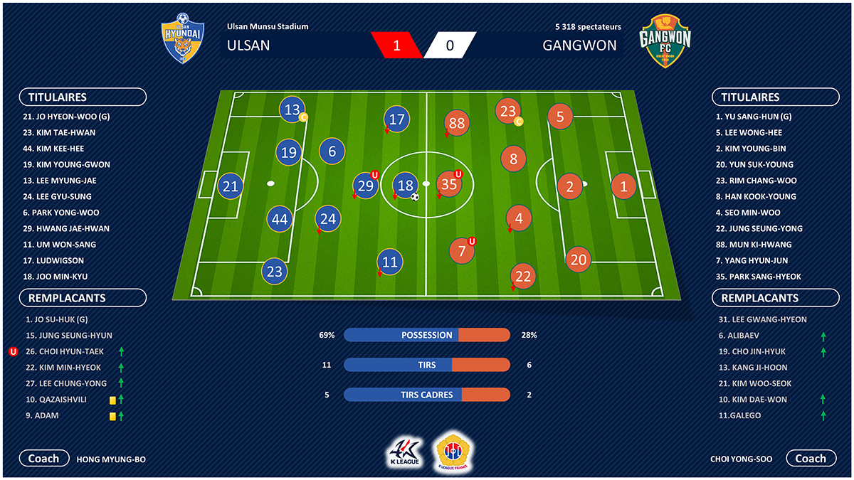 Après son déplacement victorieux à Daegu, Ulsan retrouvait le Munsu Stadium ainsi que son latéral droit, Kim Tae-hwan de retour de blessure et d’emblée titulaire, pratiquement un mois après son dernier match. Autre changement dans le onze de départ, le retour de Joo Min-kyu et Ludwigson sur le front de l’attaque. En face, Gangwon opérait de aussi des changements par rapport au match face à Suwon FC. Yu Sang-hun reprenait sa place dans les buts, Rim Chang-hoo occupait le couloir droit alors que Park Sang-hyeok occupait la pointe de l’attaque.