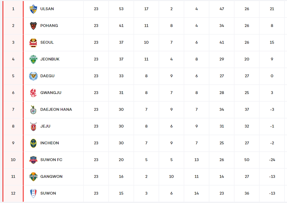 Dure semaine pour Ulsan qui a connu deux revers consécutifs. Le premier face à Incheon en toute fin de rencontre (1-2) et le second face aux Bluewings (3-1). Deux défaites face à des mal classés qui font tache, mais qui ne relancent pas pour autant le suspense en championnat puisque les Tigres ont douze points d’avance. En effet, derrière, les poursuivants n’en ont pas profité. Pohang a d’abord été accroché par les Bluewings (1-1) avant de se reprendre face à Jeju (4-2) tandis que Seoul a écrasé Suwon FC (7-2) avant de concéder le nul face à Gangwon (1-1). Même résultat pour Jeonbuk qui a été tenu en échec par Daejeon (2-2) avant de s’imposer sur le Suwon FC (1-0). À noter également que Jeju poursuit sa lente agonie avec deux nouveaux matchs sans victoires, puisqu’avant la défaite face à Pohang, les Insulaires avaient été tenus en échec par Gwangju (0-0).