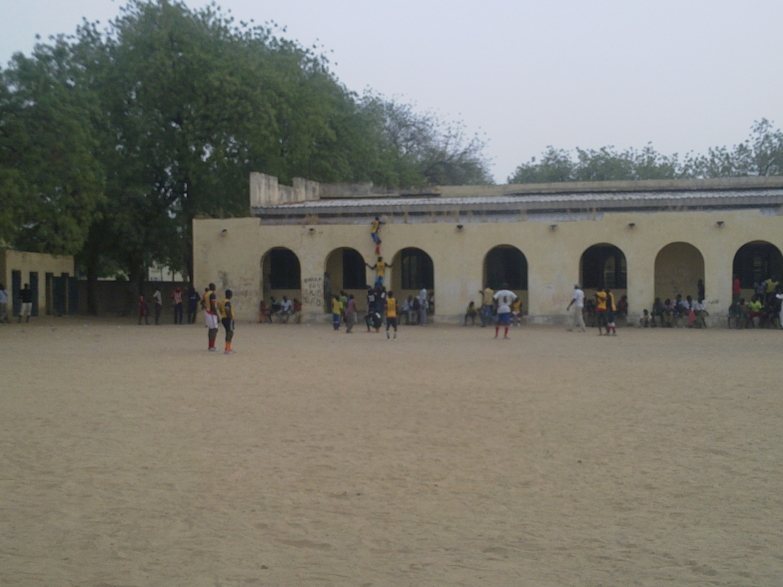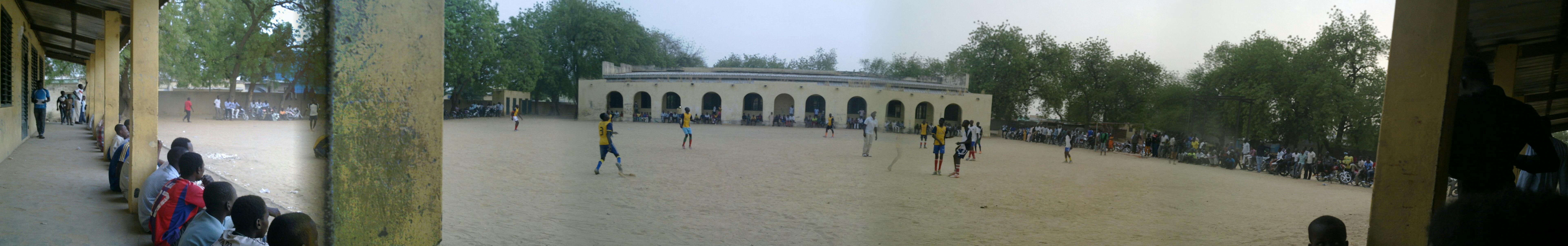 Dans le quartier d’Ambasatna, à quelques encablures du grand marché central de N’Djamena, c’est à l’intérieur du collège de la concorde qu’Idriss, Brahim et ses amis organisent deux fois dans l’année un tournoi. Cette fois-ci, 16 équipes se sont inscrites, dans une formule avec 3 matchs de poules pour chacun et un play-off. Le FC Otto, FC Clando, FC Azad et les autres s’affrontent sur un terrain en sable où il n’y a pas de marquage au sol. Entouré de deux grands bâtiments qui font partie intégrante de l’aire de jeu, les touches ne sont sifflées que quand le ballon passe derrière les spectateurs ou sur le toit. Derrière les buts démontables, ce sont les dizaines de motos alignées qui délimitent la sortie de but. Sur le terrain, les 18 joueurs de tout âge ne disposent pas de beaucoup d’espace et les imperfections du terrain ne facilitent pas un jeu fluide en tiki-taka. Les défenses sont bien en place, et le plus souvent, on a droit à beaucoup de duels et de jeu long. Mais le public trouve toujours une raison de s’enflammer : gestes techniques, penalties, grosse frappes, bagarre... tentatives pour aller chercher le ballon sur le toit, etc... La preuve, durant toute la durée du tournoi, le « stade » affiche quasiment complet, et quelques éclairs de génie permettent de célébrer ses champions éphémères.