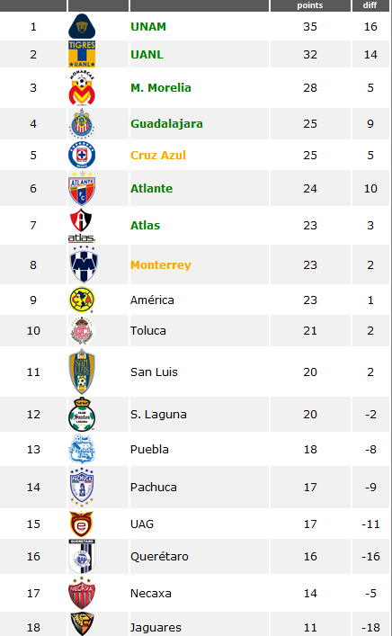 En obtenant le nul devant Cruz Azul, Chivas, actuel quatrième, n’aura besoin que d’un seul petit point la semaine prochaine pour se qualifier. L’adversaire sera une équipe en danger : le champion sortant Monterrey, actuel dernier qualifié. Chivas et Monterrey appartenant au même groupe, une victoire des Rayados pourrait cependant qualifier les deux équipes : Monterrey terminerait alors second du groupe et serait qualifié d’office, Chivas, passerait à la condition que les trois premiers du groupe 2 ne s’imposent pas. Car le groupe 2 reste le plus ouvert. Atlante mène la course et compte un point d’avance sur Atlas et América, trois sur son prochain adversaire, Toluca. Atlas et América s’en allant défier les deux meilleures équipes de la ligue la semaine prochaine, deux de ces quatre équipes pourraient bien se retrouver sur le carreau.