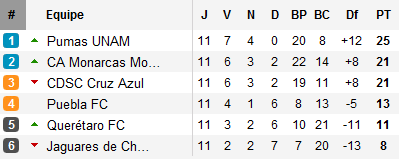 Troisième résultat nul pour Tigres qui marque un sérieux coup d’arrêt après un départ en boulet de canon. Si la première place reste la propriété des Tigres, Monterrey continue de se rapprocher. Nouvelle victoire, la troisième consécutive pour les Rayados qui s’imposent devant América et pointent désormais à une longueur du leader avant d’aller défier Toluca. Si le champion sortant est plus que jamais dans la course, le finaliste n’en finit plus de chuter. Après la fin en eau de boudin de l’ère Romano (viré pour avoir insulté les supporters), Santos Laguna offre à son nouvel entraîneur, le pire départ de l’histoire d’un coach Guerrero à avec une quatrième défaite consécutive. Santos compte désormais dix points de retard sur le leader du groupe.