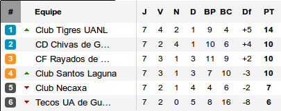 Resserrement général dans le groupe 1 : si les Tigres conservent leur place de leader en obtenant le résultat nul devant les Rayados lors de l'affiche de la journée, la défaite de Santos Laguna chez lui devant Querétaro offre à Chivas et à Necaxa l'occasion de se rapprocher. Les deux ne s'en privent pas, Chivas étrille Pachuca alors que Necaxa réalise l'exploit du jour en s'imposant trois buts à deux à Toluca après avoir été mené 2- 0 (vous avez sans doute vu l'incroyable loupé d'Ayovi sur Panenka). Conséquence, à quatre point de Tigres, se trouvent désormais trois équipes : Chivas, Monterrey et Santos, suivis, à trois longueurs, de Necaxa.