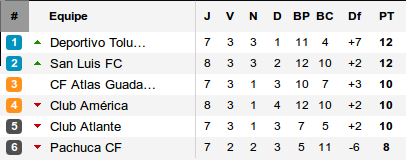 Mauvaise semaine pour le groupe 2 puisque cinq des six équipes du groupe se sont inclinées. Toluca devant Necaxa (voir plus haut), San Luis devant les Pumas, Atlas à Cruz Azul et América devant Morelia. Seule bonne opération pour Atlante qui s'impose chez les Tecos et revient ainsi à deux points du leader Toluca. Les six équipes du groupe (Pachuca, s'est également incliné, voir plus haut) se tiennent en quatre points.