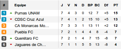 Pumas, Cruz Azul, Morelia qui dominent les équipes du groupe 2, Querétaro qui s'offre Santos, le groupe de la semaine reste incontestablement le groupe 3. Seule équipe du groupe à s'incliner, Chiapas tombe à Puebla, sixième membre du groupe. Conséquence, aucun changement au classement, les Pumas, dernière équipe invaincu de la ligue restent devant.