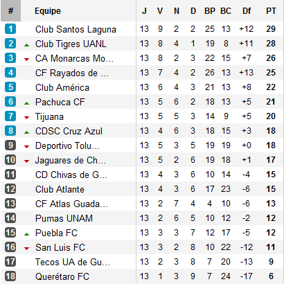 Au soir de la treizième journée du Clausura mexicain, un nouveau quatuor se forme et commence à creuser des écarts. Mais tout en haut, le duel Santos – Tigres bat son plein.