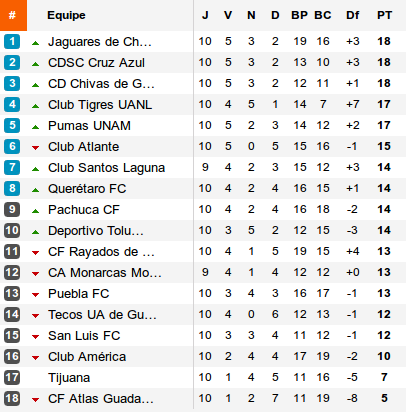 Ce qui sauve le champion continental pour l'instant, c'est qu'aucun leader ne parvient à se détacher, les quatre équipes de tête s'affrontant ce week-end et se quittant bons amis. Cruz Azul s'en remet à l'ancien bordelais Edixon Perea pour sauver un point devant Chivas alors que les Jaguares arrachent le nul sur le terrain de Tigres (but de Jorge Rodríguez dans les derniers instants).