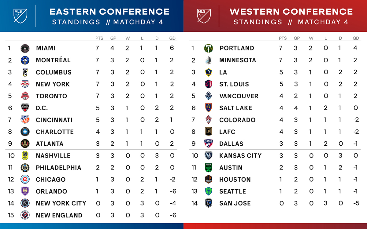 Ailleurs, Toronto finit par s’imposer face à Charlotte grâce au but de la semaine d’Insigne, Portland dispose de NYCFC, Orlando City est tombé dans le piège tendu par Minnesota United ce qui marque deux défaites de rang, le NYRB s’impose face à Dallas malgré un but de Jesus Ferreira. Atlanta United écrase New England grâce à un coup du chapeau du Grec Giakoumakis. Colorado s’impose dans ce derby des Rockies contre Salt Lake. Vancouver s’impose à San Jose qui n’a toujours pas marqué un point en 2024. Le LA Galaxy manque l’occasion rêver de s’imposer à Nashville qui avait fait tourner en vue de son match retour de CONCAChampions. Cincinnati et DC n’ont pas pu se départager et restent sur un match nul et vierge, l’absence de Christian Benteke se fait ressentir depuis son coup du chapeau inaugural.