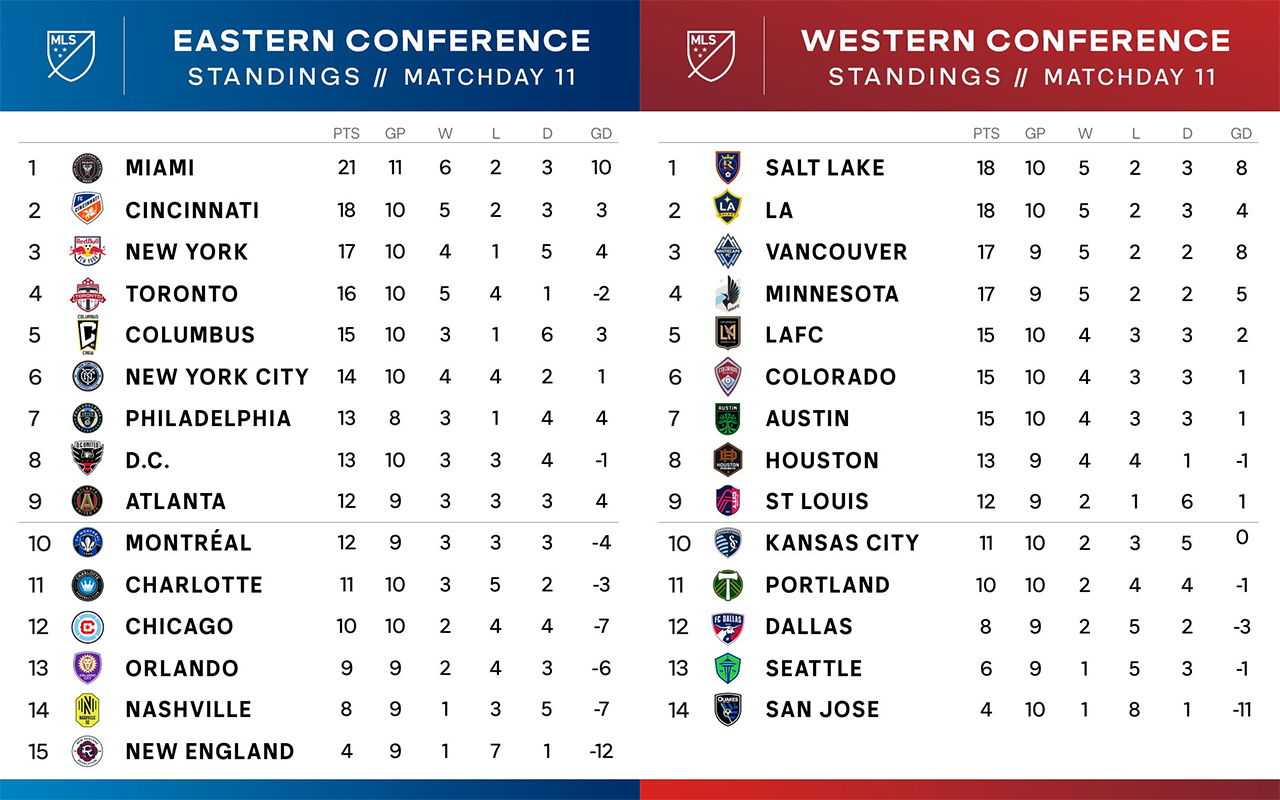 Dans les autres rencontres de cette journée, le LA Galaxy concède sa deuxième défaite de la saison face à Austin sous les yeux de Florentino Pérez. DC United s’impose face à des Sounders qui n’avancent pas, pendant que Red Bulls et Vancouver ainsi que Columbus et Montréal ne parviennent pas à se départager, le Crew faisant tourner pour mieux préparer son exploit de Monterrey en CONCACAF Champions Cup. Les leaders de l’Est, Inter Miami et Cincinnati, les premier devant plus de 60 000 personnes face à un New England à la dérive, les seconds face aux Rapids, tandis que Toronto reste dans le coup en s’imposant à Orlando. À l’Ouest, pendant que Dallas s’offre le derby texan face à Houston, Minnesota se défait du SKC et reste solidement accroché aux leaders.