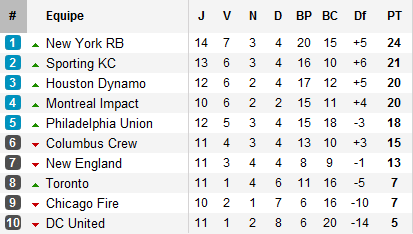 La 12e semaine de la MLS 2013 pourrait bien rester comme l’une des plus belles que ce soit en termes d’émotions, de buts et tout simplement de spectacle. A l’Est le grand match de la semaine aura basculé dans les derniers instants : un ultime coup franc Juninhesque déposé sur la tête de Tim Cahill et les Red Bulls s’offrent le double tenant du titre Los Angeles arrivé pourtant avec quelques certitudes après son carton à Philadelphie. Conséquence, New York, qui verra arriver un concurrent local en 2015, le New York City FC, mariage entre Manchester City et les New York Yankees, conserve la tête de la conférence. L’affaire est d’autant meilleure que derrière, le Sporting Kansas est accroché par la plus mauvaise équipe de la Ligue DC United pendant que Houston chute de nouveau chez lui, piégé par New England. Reste que le classement est difficile à lire en raison de l’hétérogénéité du nombre de rencontres disputées par les différents clubs de la conférence : New York reste l’équipe qui a disputé le plus de rencontres de toute la MLS (14), précédant le Sporting d’une unité et comptant deux matchs de plus que Houston, troisième, et Philadelphie, cinquième pendant que Montreal, quatrième à quatre points, dispose de 4 matchs pour recoller.
