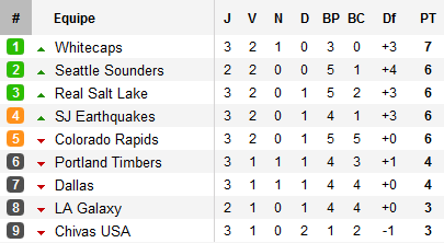 A l’Ouest, incapable de marquer face à DC United, les Whitecaps manquent l’opportunité de s’échapper mais préservent leur cage inviolée. Annoncé comme l’une des formations offensive les plus impressionnantes, Vancouver montre surtout une solidité défensive à toute épreuve, seule équipe à n’avoir pas encore encaissé le moindre but. Derrière, si le Real Salt Lake, surpris chez lui par Chivas dans les derniers instants, manque l’occasion de prendre la tête, Seattle pourrait bien en profiter. Les Sounders, qui ont tranquillement dominé Houston, réalisent également un départ sans-faute avec deux victoires en deux matchs.