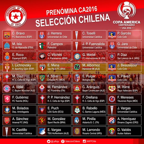 Reste enfin le tenant du titre, le Chili qui provoque quelques débats au pays. Si on peut s’interroger sur la présence d’un Johnny Herrera vu ses performances actuelles avec la U, Juan Antonio Pizzi devrait s’appuyer sur le groupe champion en titre dans lequel quelques joueurs de la Católica (Fuenzalida, Nico Castillo, la pépite Jeisson Vargas pour ne citer qu’eux) mais fera sans Jorge Valdivia (à qui il reste deux matches de suspension à purger) à la grande fureur des hinchas chiliens pendant qu’il appelle l’excellent rosarino Larrondo et annonce un quintet surprise Christian Vilches, Igor Lichnovsky, Erick Pulgar, Manuel Iturra et Marcos Bolados (que l’on imagine cependant mal passer le cut).