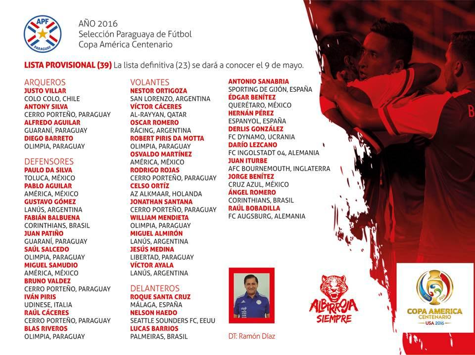 39 joueurs sont nommés côté Paraguay sans réel invité surprise. La nouvelle génération des frères Romero commence à s’installer avec l’Albirroja qui s’appuie sur un socle « d’argentins », quelques cadres aux Mexique et plusieurs européens tout en conservant les papys de l’attaque que sont les Roque Santa Cruz, Lucas Barrios et autres Nelson Valdez. Même mélange côté Vinontinto où Rafael Dudamel, qui a déjà débuté son travail avec les locaux et quelques u20, fera appel aux cadres que sont les Vizcarrondo, Seijas et autres Rondón (pour ne citer qu’eux) mais aussi aux nouvelles pépites comme l’excellent portier de Caracas Wuilker Faríñez (18 ans) et les deux européens Jhon Murillo (20 ans) - Adalberto Peñaranda (18 ans).