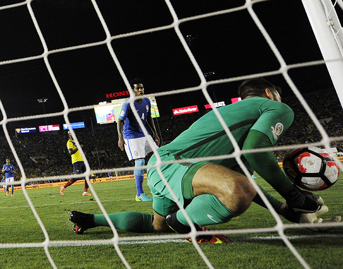 Si Miller Bolaños faisait passer le premier frisson d’entrée de partie, le premier acte était à l’avantage des hommes de Dunga. Avec un pressing au qui empêchait toute relance équatorienne, le Brésil se montrait dangereux, Willian jouait à merveille son rôle de perforateur, servait Coutinho qui butait sur Dreer ou encore lançait un mouvement sur lequel Dani Alves trouvait Coutinho dont la combinaison avec Jonas semait la panique dans la défense de la Tri. Ce Brésil-là s’avérait convaincant, multipliant les belles combinaisons, se montrant souvent dangereux, mais manquait finalement d’efficacité dans les choix décisifs (et parfois manquait parfois de quelques centimètres) pour véritablement perturber un excellent Dreer. Les 35 premières minutes étaient donc à l’avantage du Brésil qui se retrouvait pourtant en grand danger lorsque Jefferson Montero filait vers les cages d’Alisson et poussait le sacrifice d’Elias qui héritait alors d’un avertissement aux saveurs d’orange. Petit à petit, le Brésil se montrait de moins en moins dangereux, sans doute aussi échaudé par la polémique de la soirée, le but injustement refusé à Miller Bolaños. Servi en profondeur par Montero, la pépite équatorienne parvenait à redresser un ballon qui n’était pas sorti et provoquait une énorme bourde d’Alisson qui propulsait le ballon dans ses buts. Le futur portier de la Roma pouvait respirer, son sauveur portait un drapeau qu’il élevait dans le ciel pour indiquer une sortie de but inexistante, au grand dam des joueurs de Quinteros.