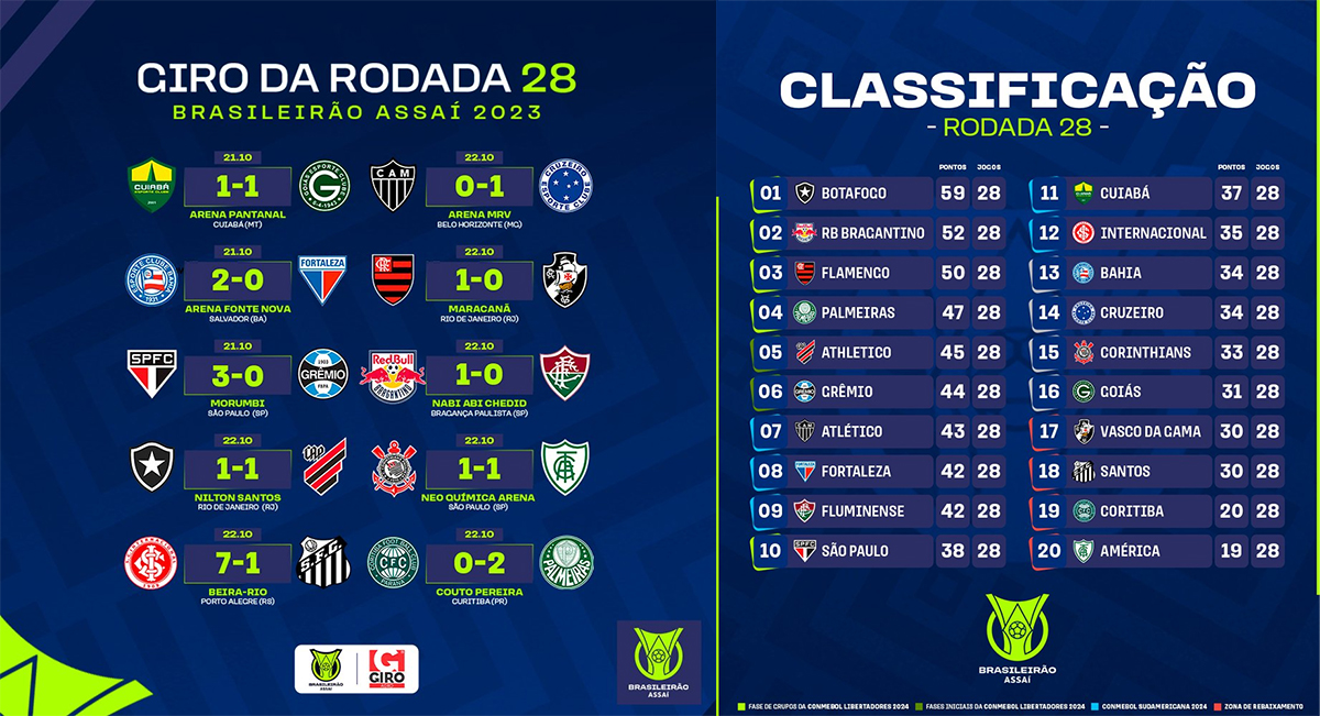 Le résultat le plus marquant de la journée est évidemment la large victoire de l’Internacional sur Santos : 4-0 à la mi-temps, 7-1 au final, le Peixe coule et reste dans le Z-4 avec le risque de connaître la relégation pour la première fois de son histoire. Le Corinthians évite de son côté à la dernière minute une défaite à domicile contre l’América Mineiro, qui reste donc la lanterne rouge, malgré la défaite de Coritiba à domicile contre Palmeiras. Après quatre défaites consécutives dans le championnat, Palmeiras retrouve la victoire et le G-4 alors que la place de dauphin est toujours occupée par le Red Bull Bragantino, vainqueur de Fluminense sur la plus petite des marges.