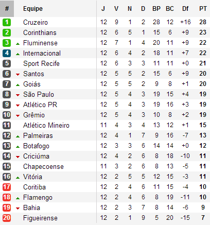 Premier enseignement, ses trois derniers champions sont présents. Neuf victoires, la dernière en forme de feu d’artifice face à Figueirense avec le huitième but de la sensation Ricardo Goulart, un nul et deux défaites, le tenant du titre Cruzeiro survole la Serie A. La meilleure attaque devance son dauphin, les Corinthians de 5 points. Le Timão de Menezes n’a certes pas le côté spectaculaire du leader mais reste une redoutable machine à gagner, n’ayant encaissé que 6 buts en 12 matchs.