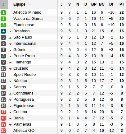 Acte 1 : neuvième journée le week-end dernier. L'occasion pour le duo Mineiro – Vasco d'asseoir son leadership. Le Galo de Ronaldinho s'offre le match fou du week-end : mené 3-1 par Figueirense à 30 minutes de la fin, l'Atlético Mineiro plante trois banderilles qui lui permettent de rentrer chez lui avec une quatrième victoire consécutive. Vasco parvient plus difficilement à prendre le dessus sur l'Atlético Goianiense grâce au sixième but de son goleador Alecsandro.
