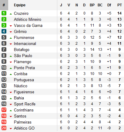 L’ouverture de la sixième journée allait annoncer un week-end explosif au Brésil. Choc incontestable, le duel Vasco – Cruzeiro aura vu la Raposa emmenée par un excellent Walter Montillo s’imposer et en profiter pour prendre la tête. Ce succès allait lancer les poursuivants à la course au rapprochement.