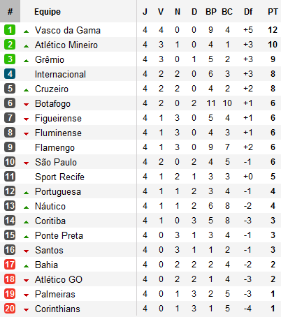 Quatre journées, un petit point. Le bilan des Corinthians est au-delà du médiocre et le Timão. A la recherche d’un premier succès, le champion sortant s’est incliné pour la troisième fois en quatre matchs à Grêmio, désormais troisième. Le Tricolor Gaúcho précède au classement son ennemi le plus proche : l’Internacional revenu bredouille de son déplacement à l’Engenhão face à Fluminense lors de la revanche du huitième de finale de la Libertadores 2012. Le Flu, à l’image de la plupart des favoris reste empêtré en milieu de tableau, accompagnant son rival Flamengo et São Paulo, deux points devant le Santos de Neymar. Le Peixe n’a toujours pas remporté la moindre rencontre et est tombé face au Tricolor pauliste lors de l’affiche de la journée sur un but signé Paulo Miranda.