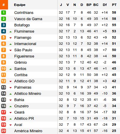 La trente-et-unième journée avait été celle de Vasco, la trente-deuxième sera celle des Corinthians. Dépossédés de leur fauteuil de leader la semaine passée, les coéquipiers de Liedson sont parvenus à arracher un précieux succès, à dix contre onze, devant Avaí, signant ainsi une dix-septième victoire leur offrant la tête de la Série A. Car dans le même temps, Vasco n'a pu prendre le dessus sur le São Paulo d'Émerson Leão.
