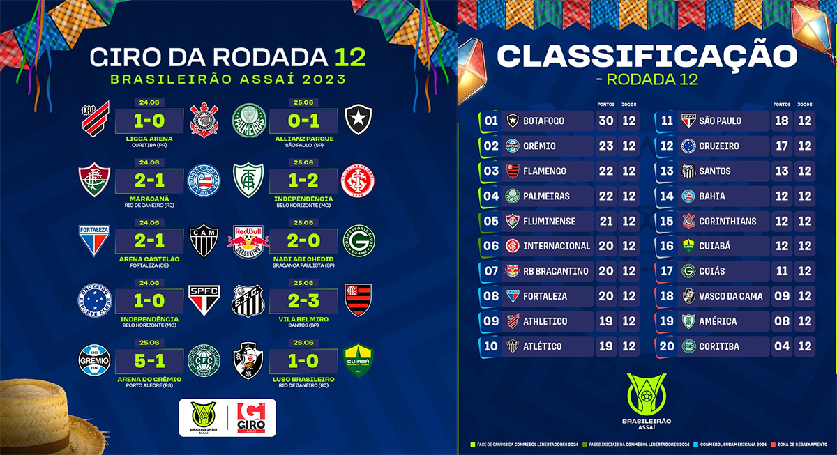 La douzième journée débute par une victoire sur la plus petite des marges de l’Athletico Paranaense sur le Corinthians, grâce à un nouveau but de Vitor Roque, son sixième dans le championnat, alors que le Corinthians a un seul petit point d’avance sur le Z-4. Fluminense parvient de son côté à inverser la tendance face à Bahia au Maracanã. Menés 1-0, réduits à dix après l’expulsion de Nino, les Tricolores s’imposent finalement 2-1 et reviennent à un point du G-4. Victoire 2-1 également pour Fortaleza face à l’Atlético Mineiro alors que Cruzeiro s’impose face à São Paulo grâce à un but contre son camp de Rafinha. Grêmio s’offre pour sa part une goleada sur Coritiba, qui n’a toujours pas gagné dans ce Brasileirão. Ce résultat permet à Grêmio de prendre la deuxième place du classement, mais la lutte s’annonce acharnée, seulement six points séparent Grêmio du douzième du classement, Cruzeiro.