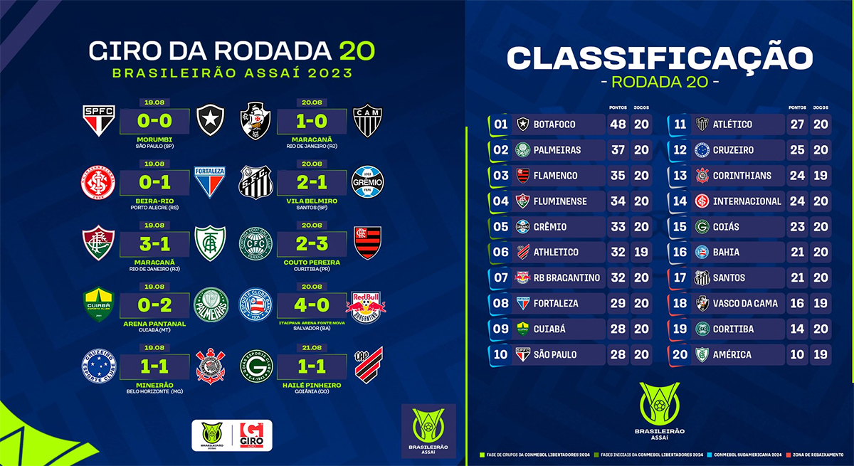 En ouverture de la vingtième journée, Botafogo résiste au São Paulo et obtient le point du match nul grâce aux arrêts de son gardien Gabriel Perri. Le Fogão reste ainsi de loin la meilleure défense du championnat avec onze buts encaissés, six de moins que Palmeiras, alors que le match a également été l’occasion de voir les nouvelles stars du Brasileirão : James Rodríguez était titulaire pour São Paulo et Diego Costa est entré en cours de jeu pour Botafogo. Dans le même temps, Fortaleza confirme sa bonne forme récente en s’imposant sur le terrain de l’Internacional sur la plus petite des marges.