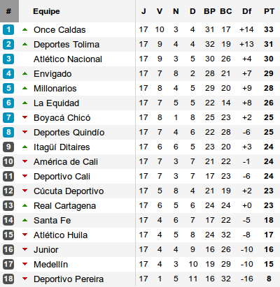 17e et avant- dernière journée de la phase régulière au cours de laquelle 25 buts ont été inscrits. Si les buts d'Once Caldas, de Tolima, d'Envigado n'ont rien changé à leur avenir proche, les répercussions sur le classement des poursuivants se sont fait sentir.