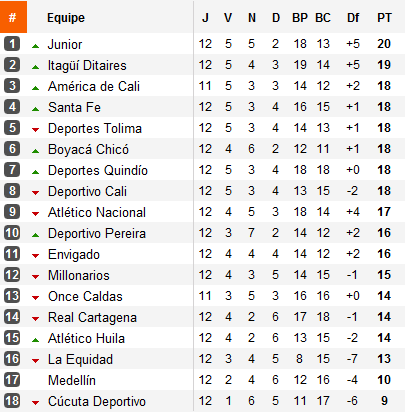 Leader après son succès de la semaine passée, le Deportes Quindio n’aura pas profité longtemps de sa position. Ecrasé par le Real Cartagena, les cuyabros perdent sept places au classement, faute à cet extrême densité en tête du championnat. L’Atlético Nacional, battu lui aussi (à Cali) imite l’ancien leader et se retrouve en dehors de la zone de qualification pour le tour final.