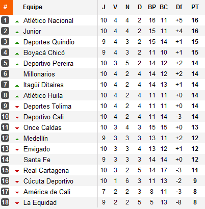 Au soir de la dixième journée, l’heure est donc à l’Atlético Nacional. Les Verdolagas s’imposent sur le terrain de l’Independiente Medellin lors du clásico et profitent du faux-pas de Junior, accroché chez lui dans les ultimes instants de la partie par Santa Fe, et des défaites du Deportes Quindio à Cali et de Boyacá Chicó chez lui devant le Deportivo Pereira. Reste que cette place de leader est fragile : Quindio et Boyacá Chicó peuvent encore venir la prendre lors de leur rencontre en retard en fin de semaine.