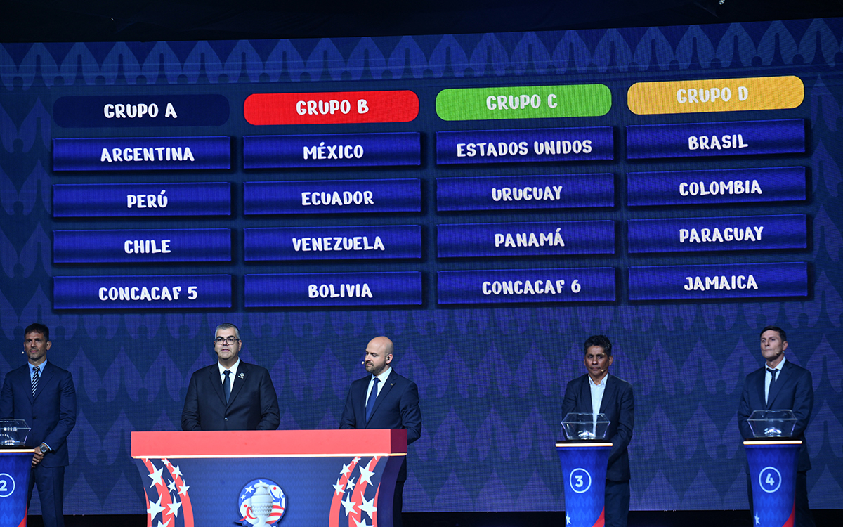 Restait donc le tirage, après une dernière séquence nous expliquant bien la procédure, un moment important. Quatre groupes de quatre, dix équipes de la CONMEBOL, six de la CONCACAF et une règle simple : pas plus de trois équipes de la CONMEBOL ni plus de deux de la CONCACAF dans un même groupe. Les quatre têtes de séries n’avaient pas droit à un tirage, chacun étant assigné dans son groupe, faisant ainsi qu’Argentine et Brésil ne peuvent pas se croiser avant la finale, le table croisant en quarts et en demies les membres des groupes A et B d’un côté, ceux des groupes C et D de l’autre. Vint alors le couac. Alors que le tirage ne laissait aucune autre place à la Bolivie que le Groupe C, celle-ci fut tirée en deuxième parmi les membres du chapeau 4 et placée… dans le Groupe B. Conséquence, le vainqueur du barrage entre Honduras et Costa Rica, tiré ensuite, fut placé dans le C, donnant à ce groupe trois membres de la CONCACAF… Qu’importait, le tirage se poursuivait, la Jamaïque héritait du groupe D, celui du Brésil, de la Colombie et du Paraguay.
