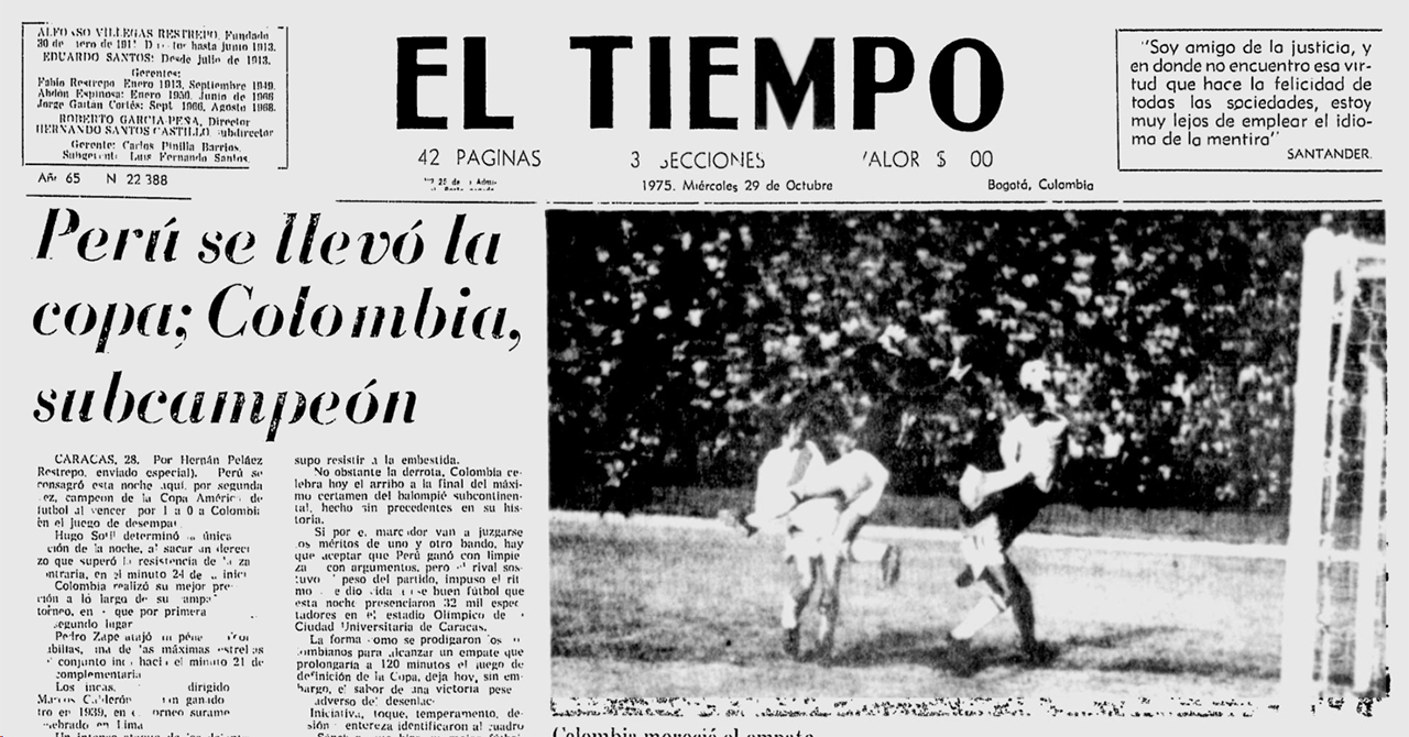 L’adversaire se nomme Pérou. Emmené par sa génération dorée, sans doute la plus belle de son histoire, symbolisée par son duo Teófilo Cubillas – Hugo Sotil, mais comptant aussi des joueurs comme Percy Rojas, Héctor Chumpitaz ou encore Juan Carlos Oblitas. À la tête de la Blanquirroja, l’entraîneur qui restera le technicien le plus titré de l’histoire du football péruvien, Marcos el Chueca Calderón, dont le destin sera brisé par la tragédie de l’Alianza Lima en 1987 (lire L’histoire d’un nom (14) : Alianza Lima). En demi-finales, le Pérou s’est offert le Brésil de Rivelino et Falcao grâce à une folle victoire au Minerão (3-1) et une histoire folle, celle d’un tirage au sort consécutif à la victoire du Brésil à Lima (2-0) et effectué par Verónica Salinas, fille de Teófilo Salinas, président de la Confederación Sudaméricana de Fútbol et accessoirement péruvien. Le tirage se peuple de rumeurs et autres légendes après les mots de son père, « il était impossible que l’on perde le tirage chez nous », les théoriciens du complot ayant suggérés que le papier sur lequel était écrit « Perú » avait été précédemment passé au congélateur pour être plus facilement repérable. Quelles que soient les légendes, le Pérou se présente donc au Campín le 16 octobre où un coup franc de Ponciano Castro fait chavirer les 60 000 âmes venues se masser dans une enceinte censée n’en accueillir que 35 000. Mais la Colombie s’incline à Lima, le Pérou étant pourtant privé de ses stars Teófilo Cubillas et Hugo Sotil, tous deux retenus par leurs clubs (respectivement Porto et le FC Barcelone). Un match d’appui est alors nécessaire pour départager les deux formations, il se déroule à Caracas le 28 octobre 1975. Cubillas est là, el Cholo Sotil aussi. Ce dernier a fugué depuis Barcelone. À la 25e minute, une lourde frappe de Cubillas revient dans les pieds de Sotil, el Cholo contrôle et frappe, le Pérou s’impose 1-0 et décroche son deuxième titre, à ce jour son dernier. Pour la Colombie, privée alors d’un Willington Ortiz blessé, la défaite est amère, mais laisse augurer des lendemains qui chantent. Il faut pourtant attendre un nouveau siècle pour retrouver une finale.