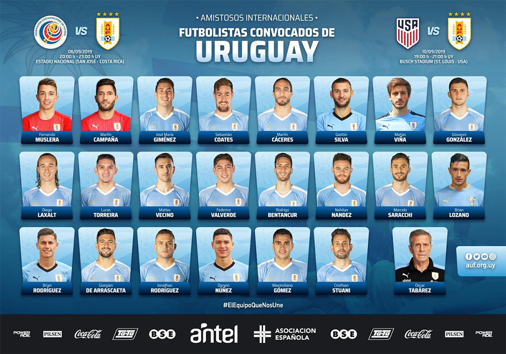 Óscar Tabárez a dévoilé sa liste de vingt-deux joueurs pour les amicaux de septembre contre le Costa Rica le vendredi 6 septembre puis contre les Etats-Unis le mardi 10 septembre.