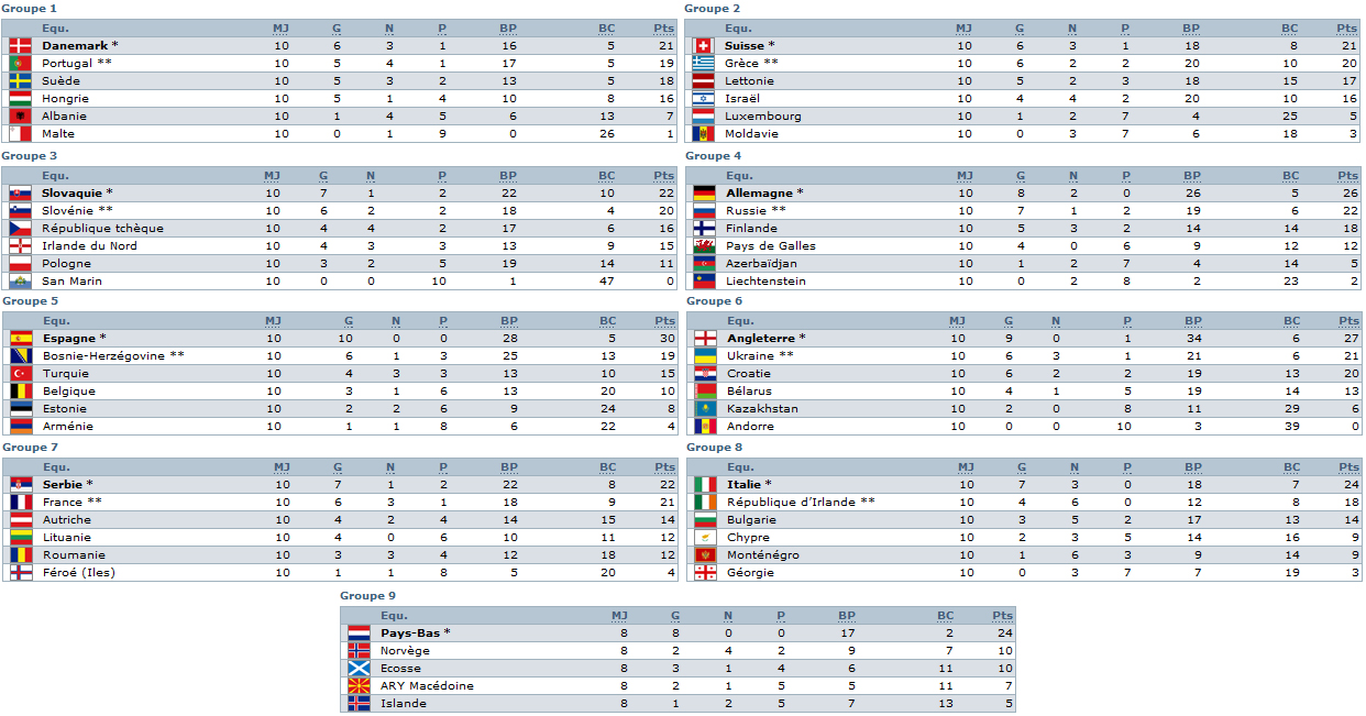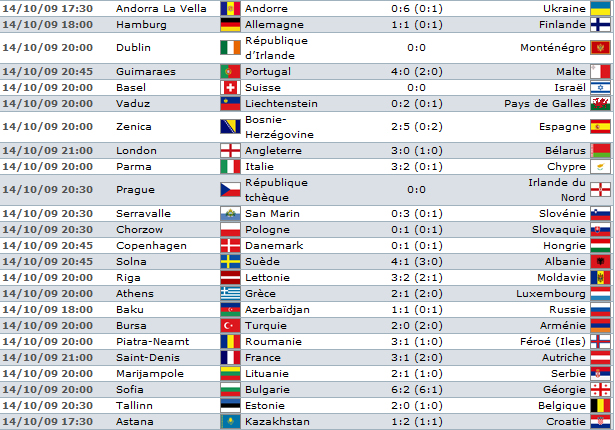 Ce qu’il faut retenir : Les deux dernières places directes pour l’Afrique du Sud ont donc été attribuées à la Suisse et à la Slovaquie. Les suisses ont empoché le point nécessaire face à Israël alors que les Slovaque, sous la menace Slovène depuis la défaite du week-end passé, ont du batailler ferme dans la neige polonaise pour ramener la victoire nécessaire. Il ne reste donc plus qu’à attribuer les 4 dernières places pour lesquelles huit équipes vont lutter mi-novembre. Les huit barragistes sont donc la France, la Bosnie, la Russie, l’Irlande qui jouaient hier pour l’honneur mais aussi le Portugal, la Grèce, la Slovénie et l’Ukraine, qui auront eu le mérite de ne pas trembler hier et ainsi maintenir un espoir de mondial. Le tirage au sort des matchs aura lieu lundi prochain en sachant que France, Grèce, Russie et Portugal sont têtes de série et ne pourront donc s’affronter.